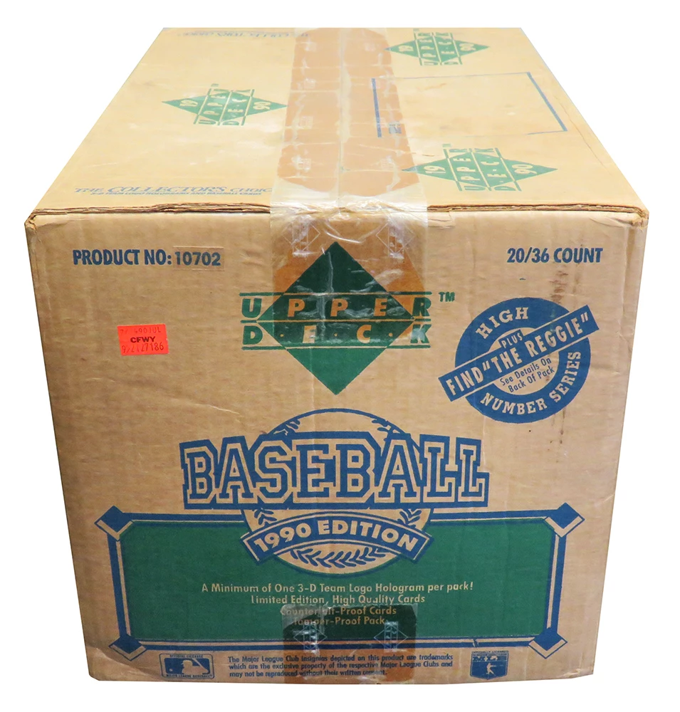 This is for one (1) Factory sealed unopened 20 box CASE of 1990 Upper Deck High # Series (Find the Reggie) baseball cards. The case is in good condition with the original Upper Deck factory tape still intact, ensuring that the case has never been opened. The case contains 20 boxes (36 packs per box). Outside of the sealed case has a stamp date of July 24 1990.