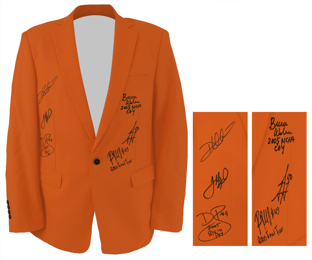 2005 Illinois Fighting Illini team signed Mogu men’s orange blazer sport coat jacket with 6 signatures and 3 inscriptions. The sport coat is signed by the 5 main 2005 starters and head coach which includes: Deron Williams, Dee Brown with ‘2005 Big 10 POY’, Luther Head, Roger Powell Jr with ‘2005 Final Four’, James Augustine, and Bruce Weber (head coach) with ‘2005 NCAA COY’. Item comes with a Schwartz Sports Memorabilia tamper-proof numbered hologram and Certificate of Authenticity which can be verified online.