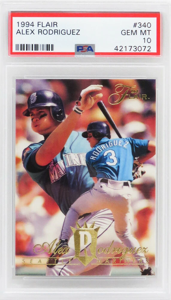 This is for one (1) Alex Rodriguez Seattle Mariners 1994 Flair baseball #340 RC rookie card, which has been encapsulated and graded Gem Mint 10 by PSA, the highest grade available for this Mint condition card. We have more than one of this Graded Card in stock in the same PSA grade. We have included a stock photo for this item and the Graded Card you will receive will be of the card described, with the same grade as shown. You may or may not receive the exact PSA serial number on the slab label shown in image.