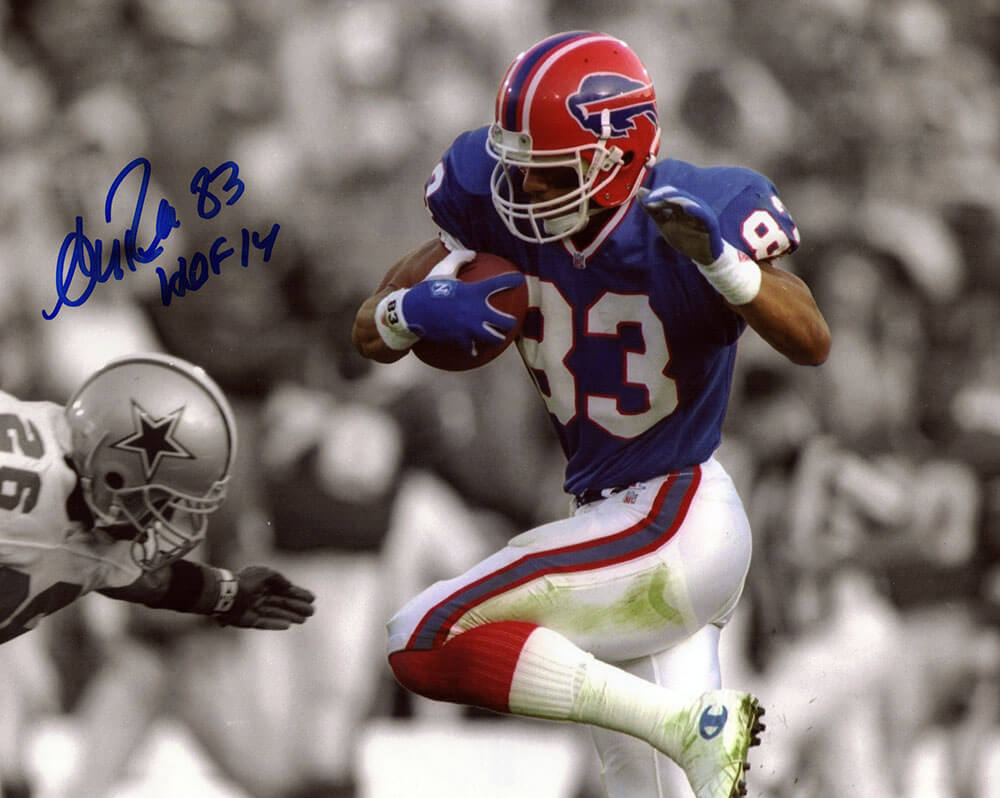 Andre Reed signed Buffalo Bills spotlight action vs. Cowboys 8×10 photo with ‘HOF 14’ inscription. Item comes with a Schwartz Sports Memorabilia tamper-proof numbered hologram and Certificate of Authenticity which can be verified online.
