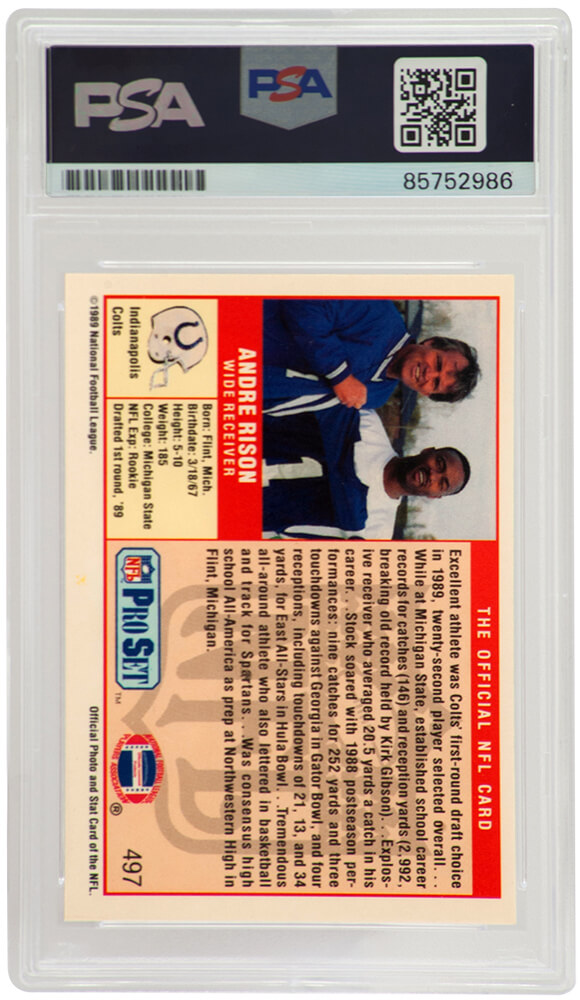 Andre Rison Signed Michigan State image 1989 NFL Pro Set rookie football card #497 with ‘Bad Moon’ inscription. The card has been authenticated and encapsulated by PSA/DNA and the number can be verified online.