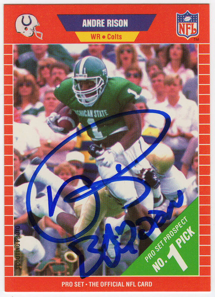 Andre Rison Signed Michigan State image 1989 NFL Pro Set rookie football card #497 with ‘Bad Moon’ inscription. Item comes with a Schwartz Sports Memorabilia tamper-proof numbered hologram (on back of physical card) and Certificate of Authenticity which can be verified online.
