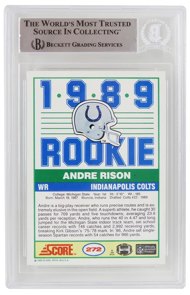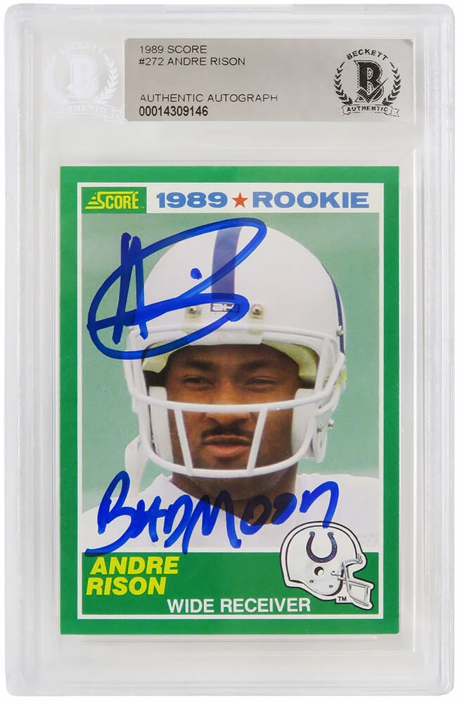 Andre Rison Signed Indianapolis Colts 1989 Score rookie football trading card #272 with ‘Bad Moon’ inscription. The card has been authenticated and encapsulated by Beckett Authentic and the authentication number can be verified online. The image of the item is a stock photo, as we may have multiples of the item in stock. The Slabbed Card you will receive will be of the card described. (Same grade, Same authentication) You may or may not receive the exact Beckett serial number on the slab label shown in image.