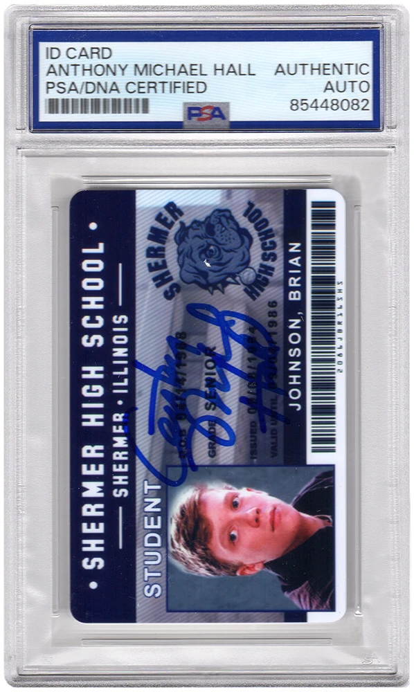 Anthony Michael Hall signed The Breakfast Club Brian Johnson Shermer High School novelty ID card. The card has been authenticated and encapsulated by PSA and the authentication number can be verified online.