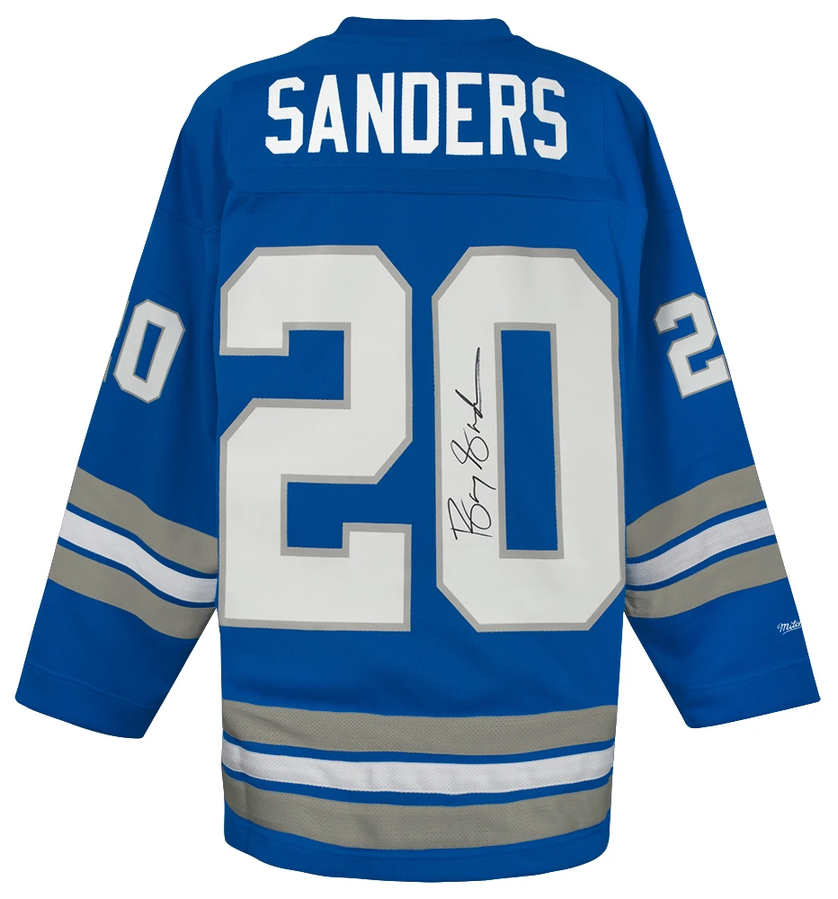 Barry Sanders Signed Detroit Lions blue Maxxed Out Fashion Mitchell & Ness hockey jersey. Item comes with a Schwartz Sports Memorabilia tamper-proof numbered hologram and Certificate of Authenticity which can be verified online.