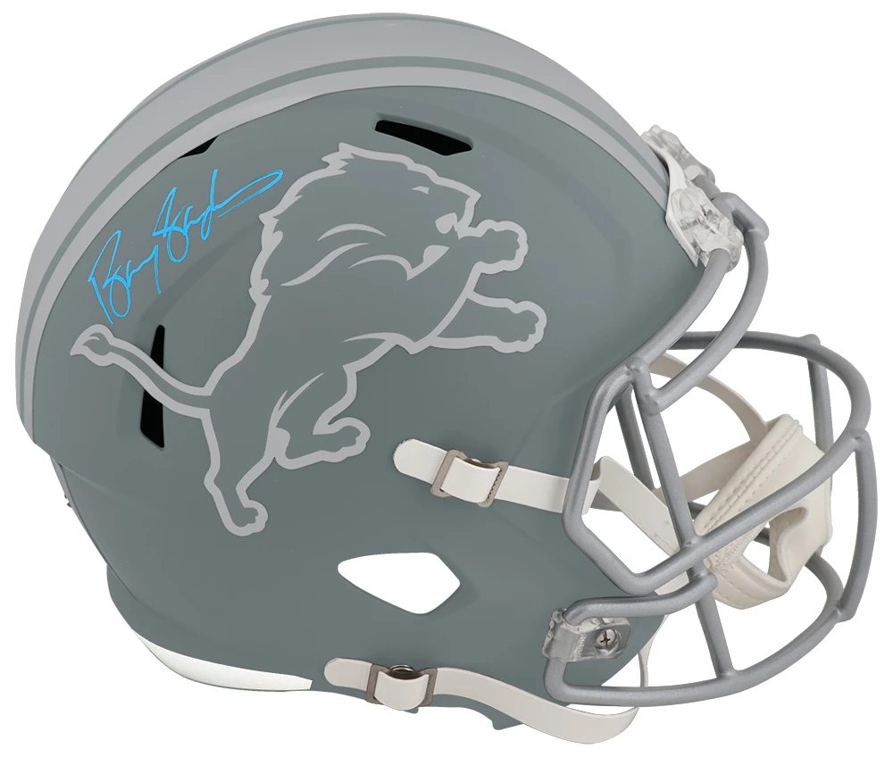 Barry Sanders signed Detroit Lions SLATE Riddell full size speed replica helmet. Item comes with a Schwartz Sports Memorabilia tamper-proof numbered hologram and Certificate of Authenticity which can be verified online.