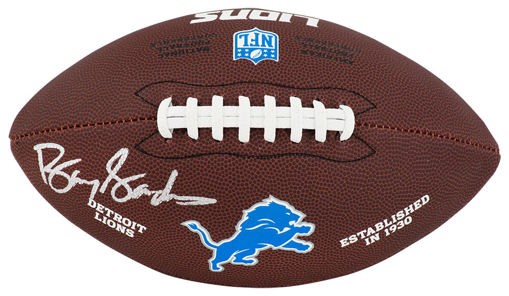 Barry Sanders signed Wilson Detroit Lions brown logo full size football. Item comes with a Schwartz Sports Memorabilia tamper-proof numbered hologram and Certificate of Authenticity which can be verified online.