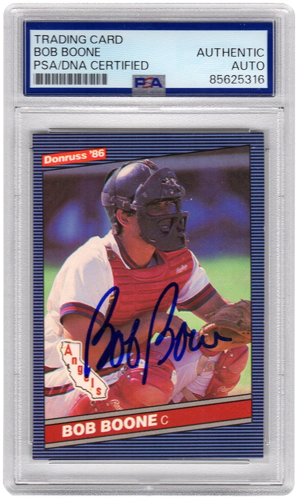 Bob Boone signed baseball trading card (various cards). The card has been authenticated and encapsulated by PSA and the authentication number can be verified online.