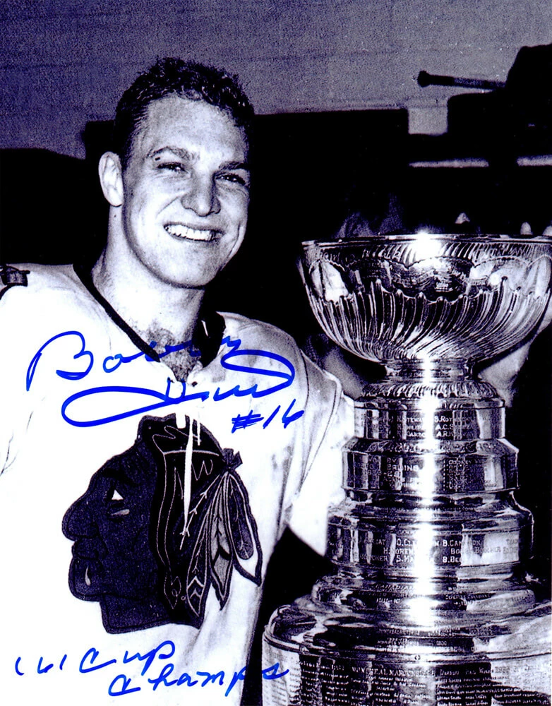 Bobby Hull signed Chicago Blackhawks black and white with Stanley Cup 8×10 photo with ’61 Cup Champs’ inscription. Item comes with a Schwartz Sports Memorabilia tamper-proof numbered hologram and Certificate of Authenticity which can be verified online.