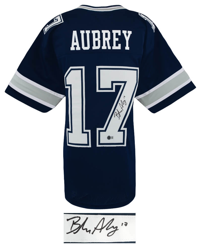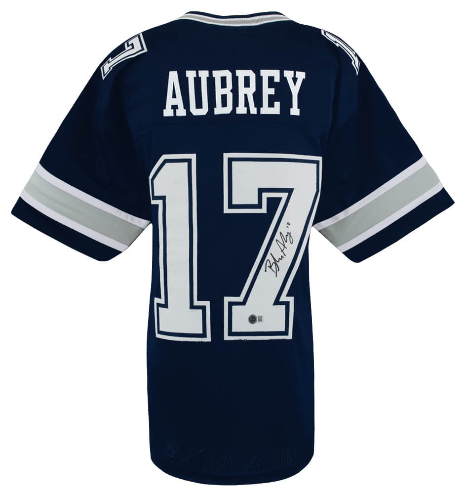 Brandon Aubrey signed navy custom football jersey. Item comes with a Beckett Authentication tamper evident numbered sticker and matching Certificate of Authenticity which can be verified online.