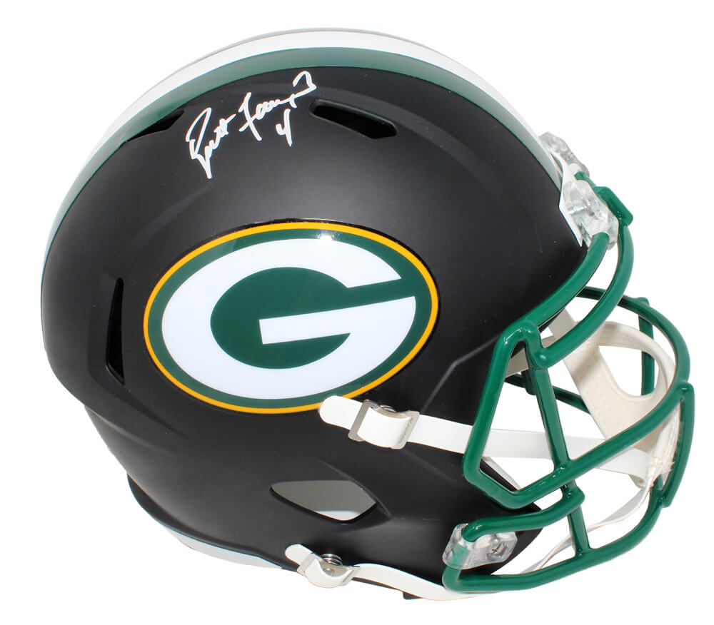 Brett Favre signed Green Bay Packers flat black matte Riddell full size replica speed helmet. Item comes with the Brett Favre personal numbered tamper-proof hologram along with a Schwartz Sports Memorabilia tamper-proof numbered hologram and certificate of authenticity which can be verified online.