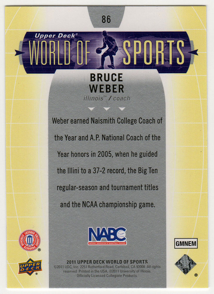 Bruce Weber signed Illinois 2011 Upper Deck World of Sports coaching basketball trading card #86. Item comes with a Schwartz Sports Memorabilia tamper-proof numbered hologram (on back of physical card) and Certificate of Authenticity which can be verified online.