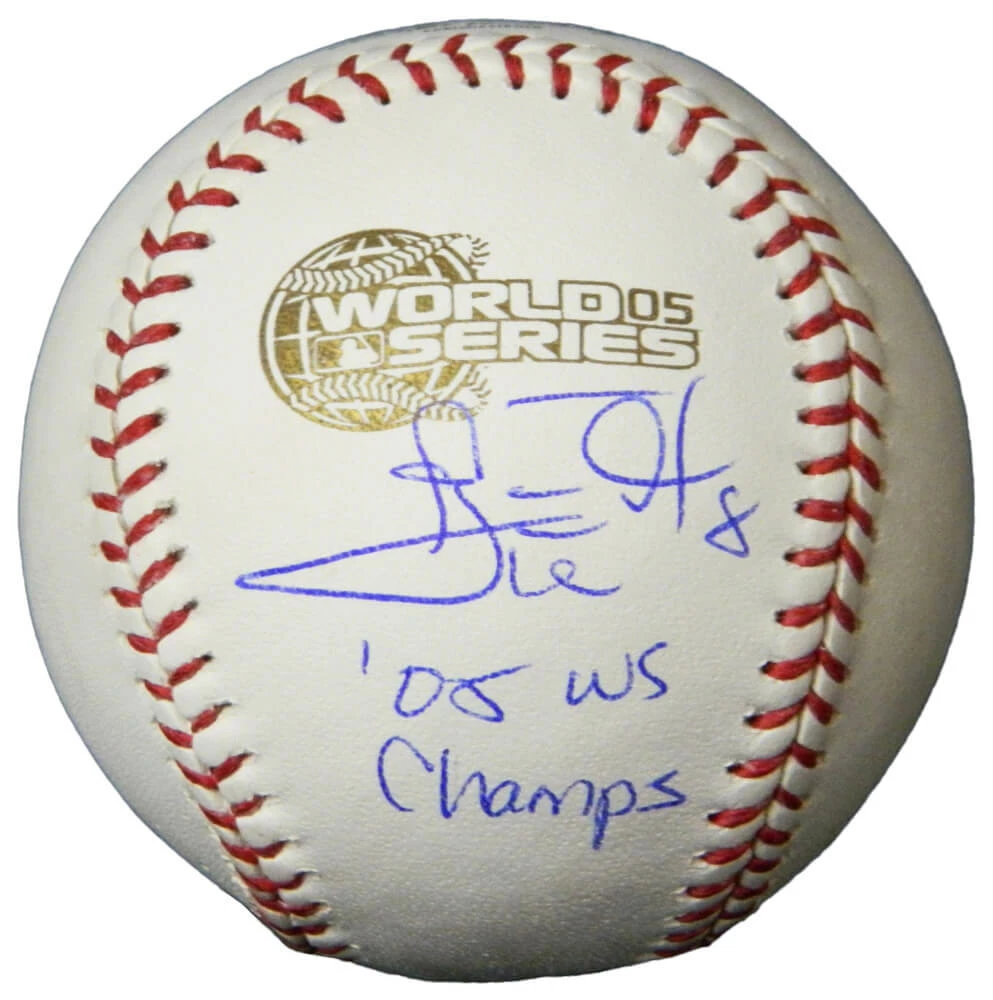 Carl Everett signed Rawlings official 2005 World Series baseball with ’05 WS Champs’ inscription. Item comes with a Schwartz Sports Memorabilia tamper-proof numbered hologram and Certificate of Authenticity which can be verified online.