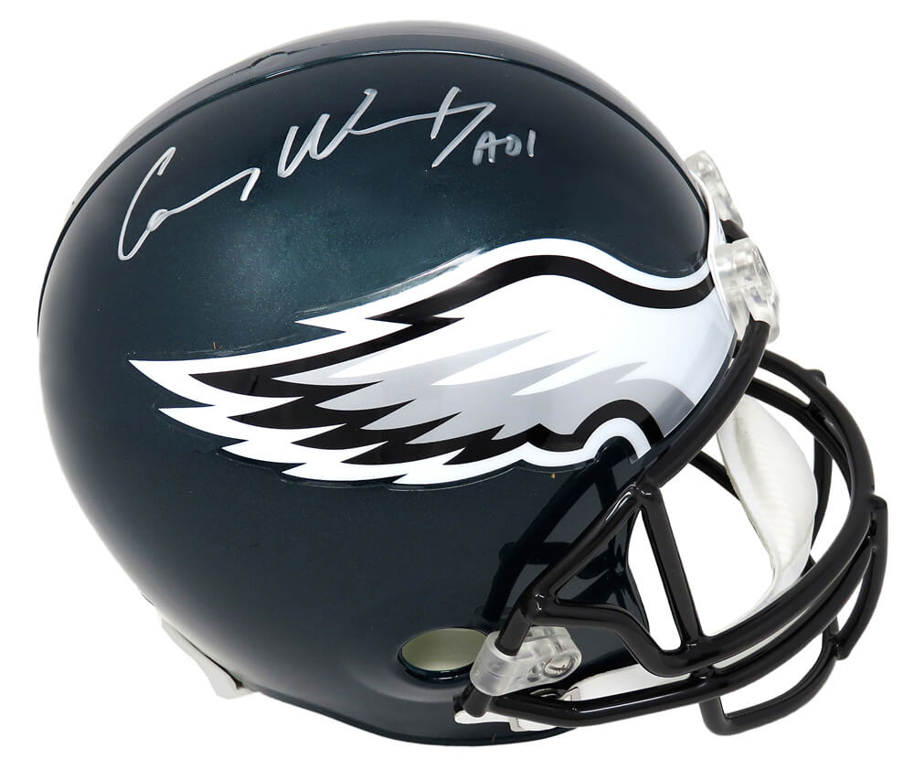 Carson Wentz signed Philadelphia Eagles Riddell full-size replica helmet. Item comes with a Fanatics Authentic tamper-proof numbered hologram and Certificate of Authenticity which can be verified online.