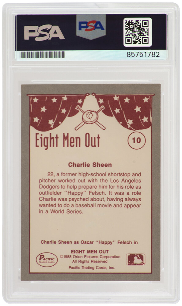 Charlie Sheen signed Eight Men Out 1988 Pacific trading card #10 . The card has been authenticated and encapsulated by PSA/DNA and the number can be verified online.