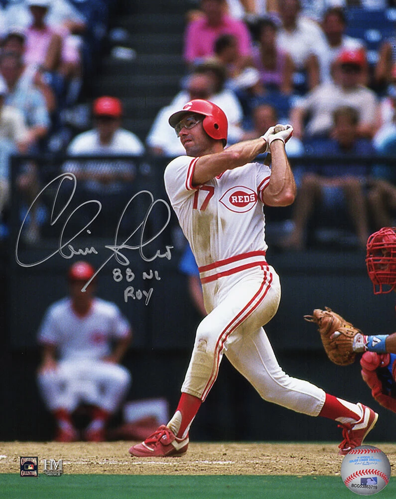 Chris Sabo signed Cincinnati Reds swinging action 8×10 photo with ’88 NL ROY’ inscription. Item comes with a Schwartz Sports Memorabilia tamper-proof numbered hologram and Certificate of Authenticity which can be verified online.