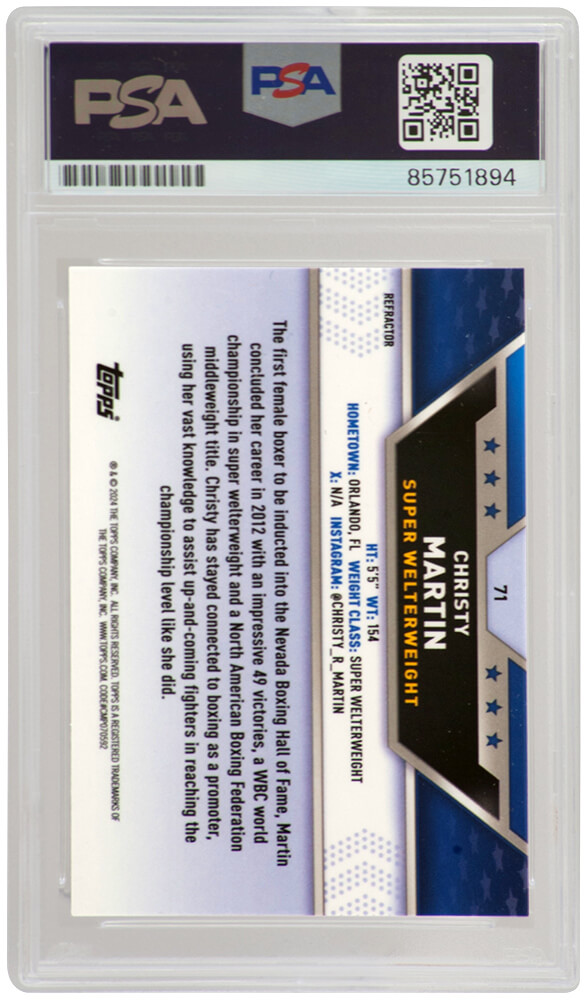 Christy Martin signed 2024 Topps Chrome Refractor boxing trading card #71. The card has been authenticated and encapsulated by PSA/DNA and the number can be verified online.