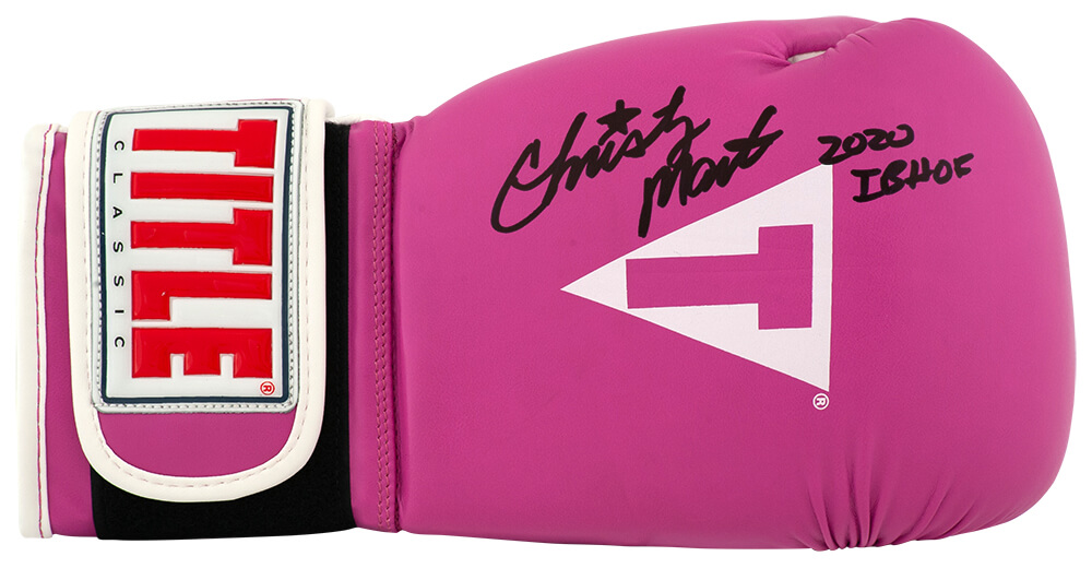 Christy Martin signed Title pink and white boxing glove with ‘2020 IB HOF’ inscription. Item comes with a Schwartz Sports Memorabilia tamper-proof numbered hologram and Certificate of Authenticity which can be verified online.