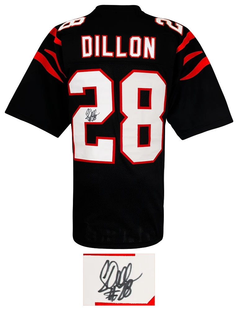 Corey Dillon signed black custom football jersey. Item comes with a Schwartz Sports Memorabilia tamper-proof numbered hologram and Certificate of Authenticity which can be verified online. Jersey is size XL.