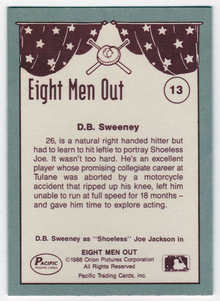D.B. Sweeney signed Eight Men Out Shoeless Joe 1988 Pacific trading card #13. Item comes with a Schwartz Sports Memorabilia tamper-proof numbered hologram (on back of physical card) and Certificate of Authenticity which can be verified online.