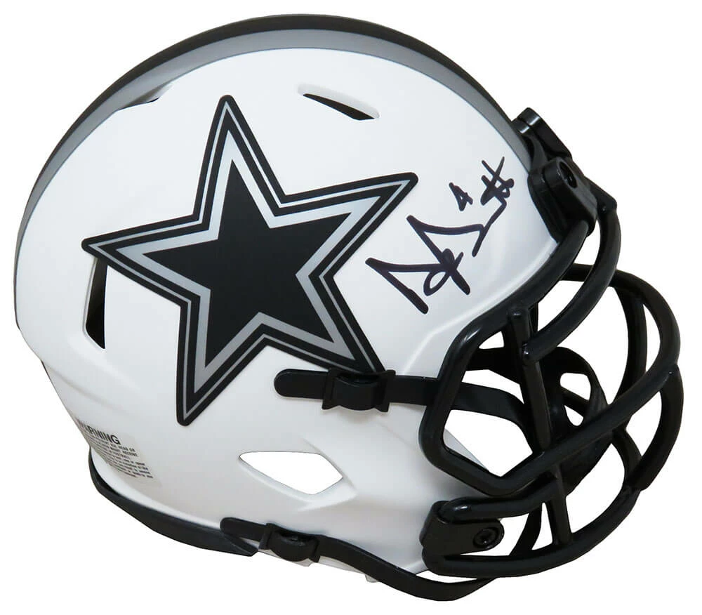 Dak Prescott signed Dallas Cowboys Lunar Eclipse white matte Riddell speed mini helmet. Item comes with a Schwartz Sports Memorabilia tamper-proof numbered hologram and Certificate of Authenticity which can be verified online.
