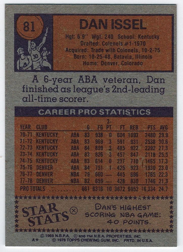 Dan Issel signed Denver Nuggets 1978 Topps basketball trading card #81 with ‘HOF 93’ inscription. Item comes with a Schwartz Sports Memorabilia tamper-proof numbered hologram (on back of physical card) and Certificate of Authenticity which can be verified online.