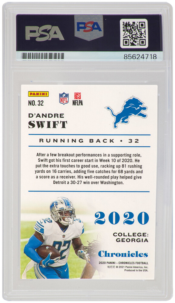D’Andre Swift signed Detroit Lions 2020 Panini Chronicles rookie football card #32. The card has been authenticated and encapsulated by PSA and the authentication number can be verified online.