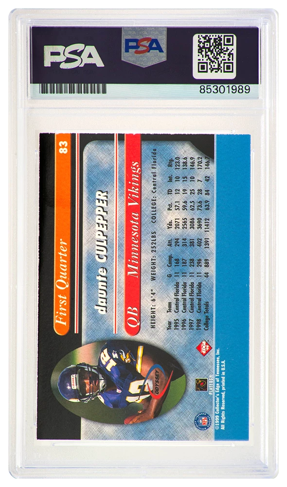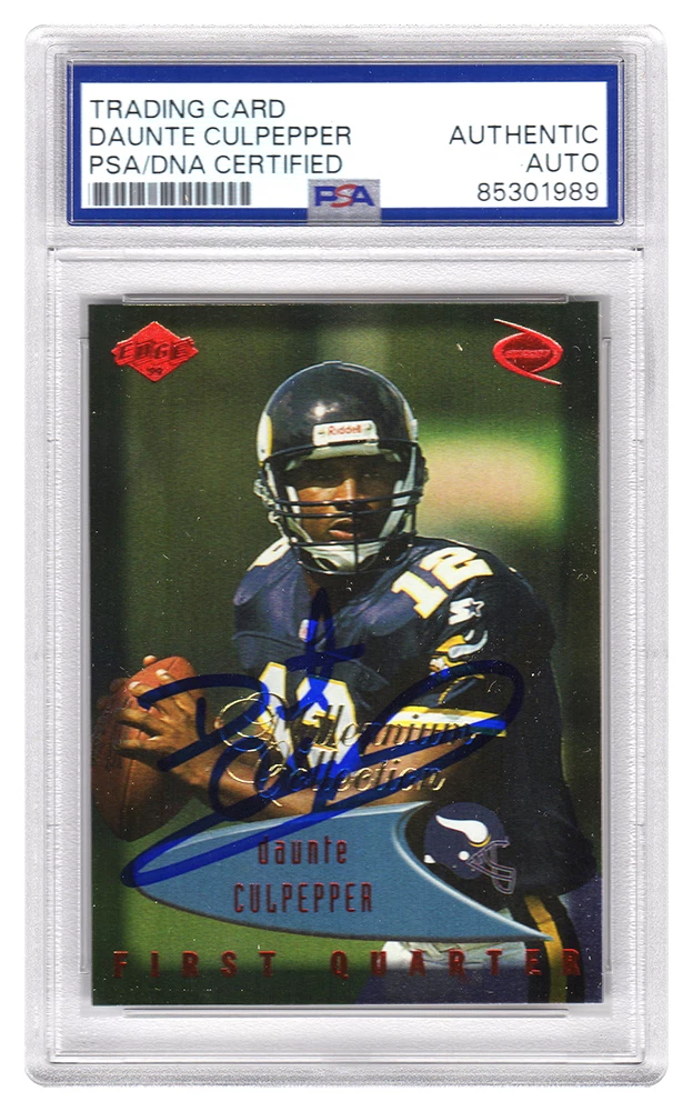 Daunte Culpepper signed Minnesota Vikings 1999 Edge Odyssey rookie football trading card #83. The card has been authenticated and encapsulated by PSA and the authentication number can be verified online.