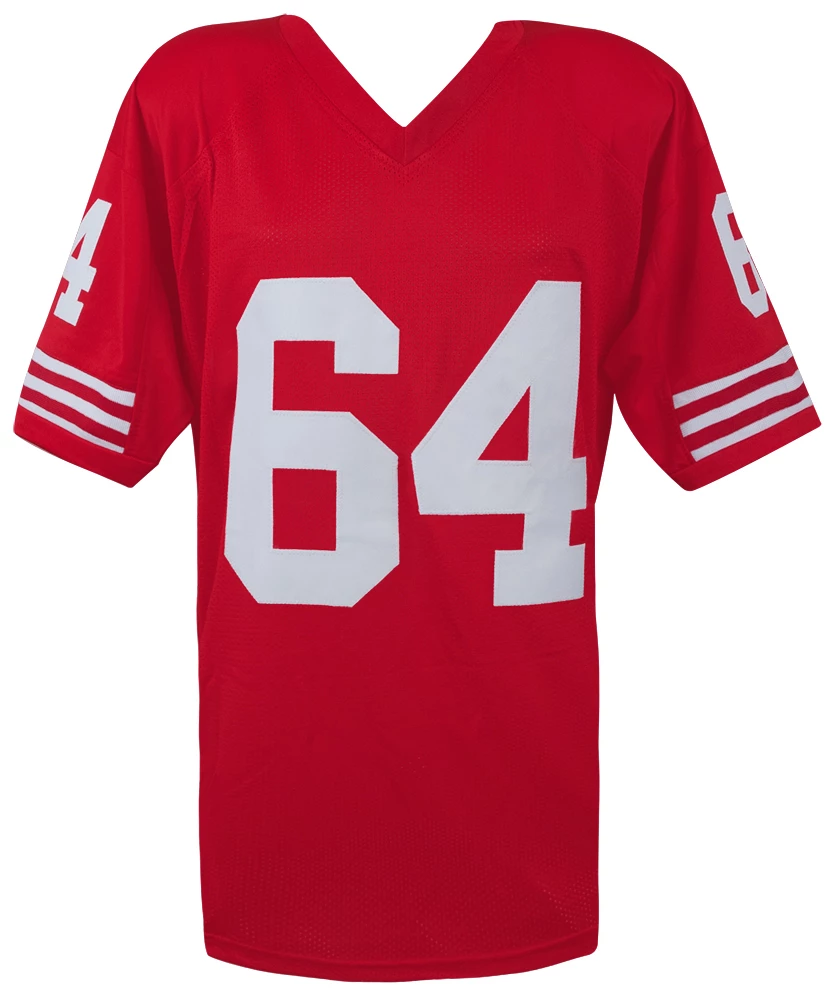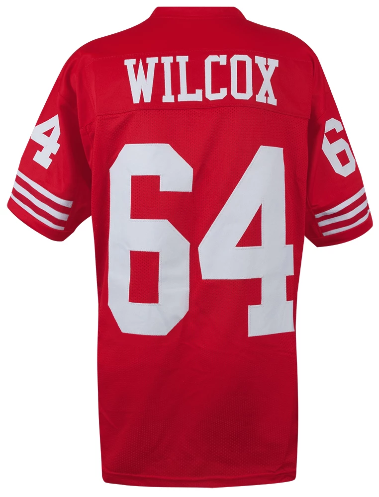 Dave Wilcox red custom pro football jersey size men’s adult X-Large. Jersey comes with sewn on name and numbers but has no logos, emblems or brand tags. This jersey is brand new and perfect for wearing to support your favorite team and player or to have autographed.