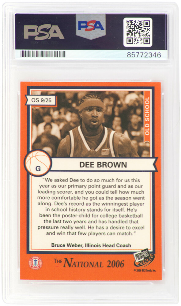 Dee Brown signed 2006 Press Pass old school basketball trading card #9. The card has been authenticated and encapsulated by PSA and the authentication number can be verified online.
