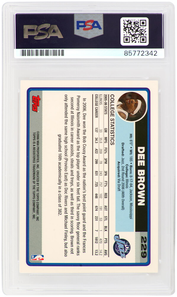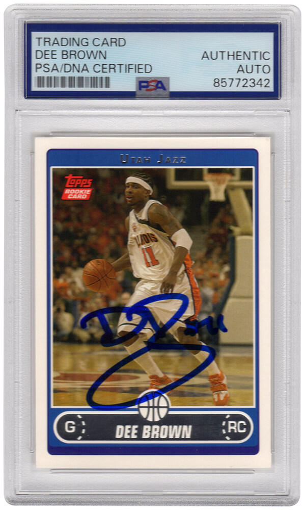 Dee Brown signed 2006 Topps rookie basketball trading card #229. The card has been authenticated and encapsulated by PSA and the authentication number can be verified online.