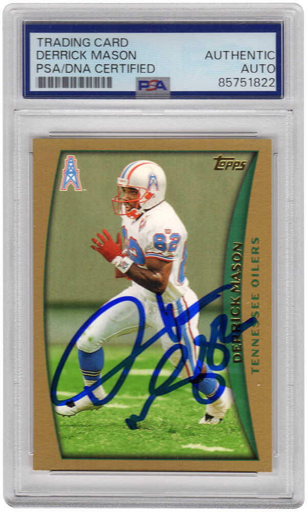 Derrick Mason signed Houston Oilers 1998 Topps football trading card #102. The card has been authenticated and encapsulated by PSA/DNA and the number can be verified online.