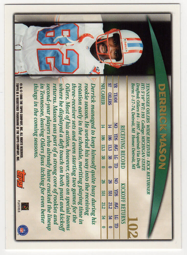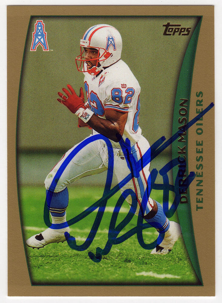 Derrick Mason signed Houston Oilers 1998 Topps football trading card #102. Item comes with a Schwartz Sports Memorabilia tamper-proof numbered hologram (on back of physical card) and Certificate of Authenticity which can be verified online.