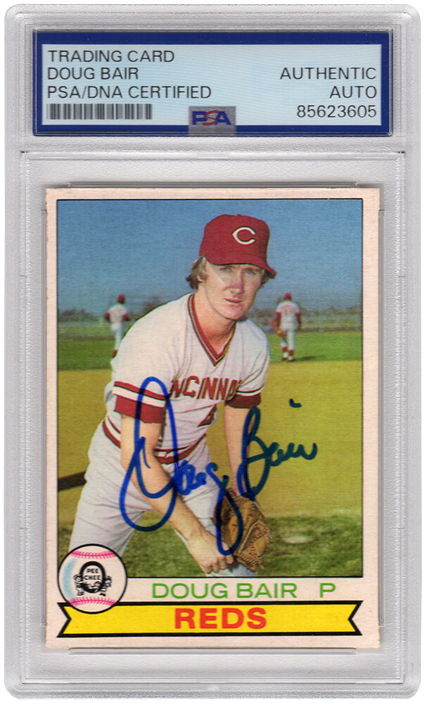 Doug Bair signed Reds baseball trading card (various cards). The card has been authenticated and encapsulated by PSA and the authentication number can be verified online.