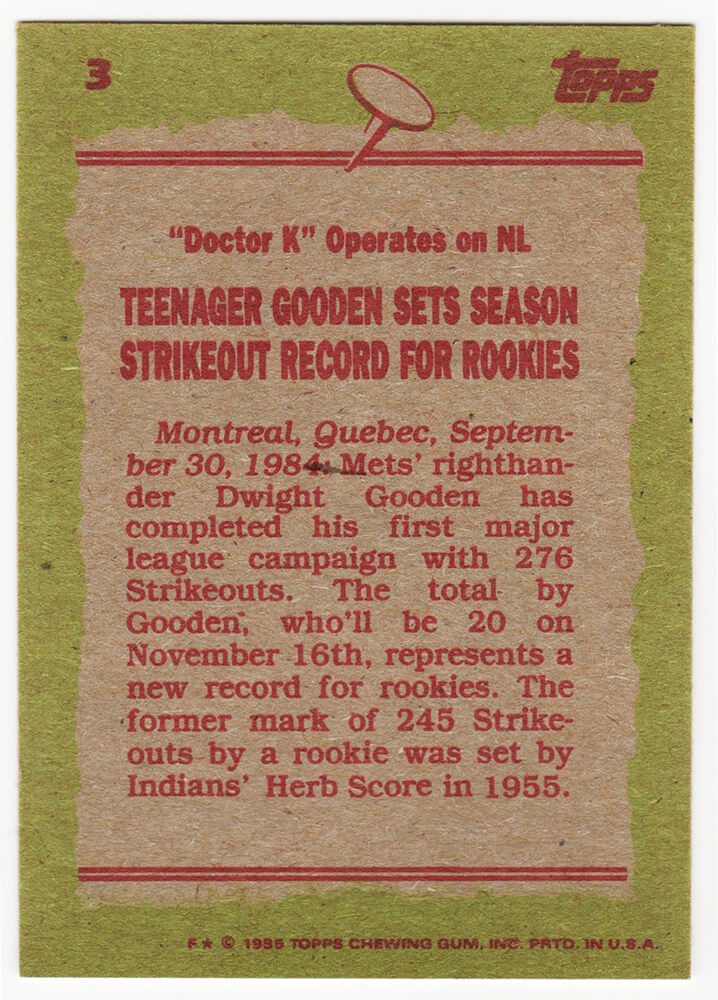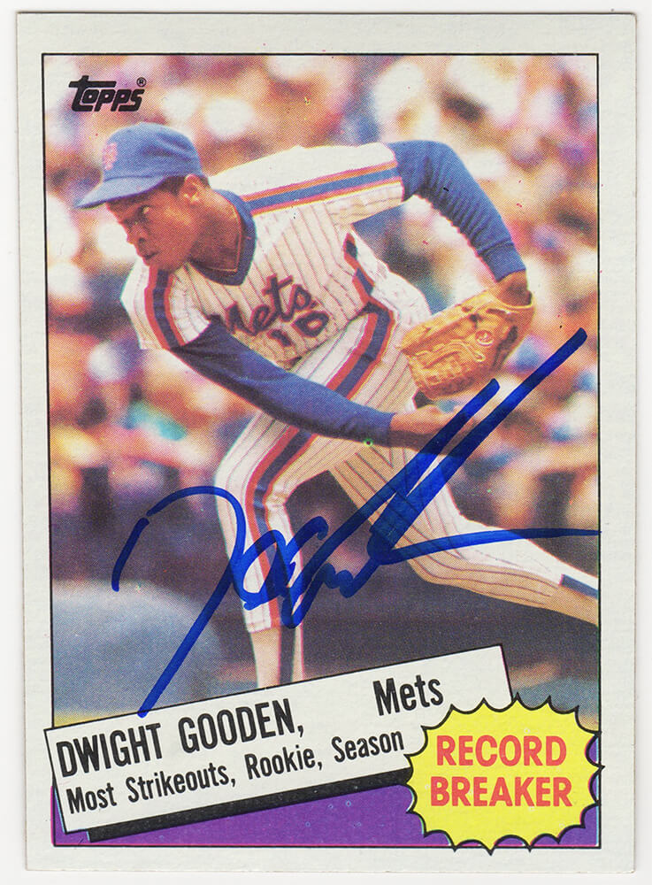 Dwight Gooden signed New York Mets 1985 Topps Record Breaker baseball trading card #3. Item comes with a Schwartz Sports Memorabilia tamper-proof numbered hologram (on back of physical card) and Certificate of Authenticity which can be verified online.