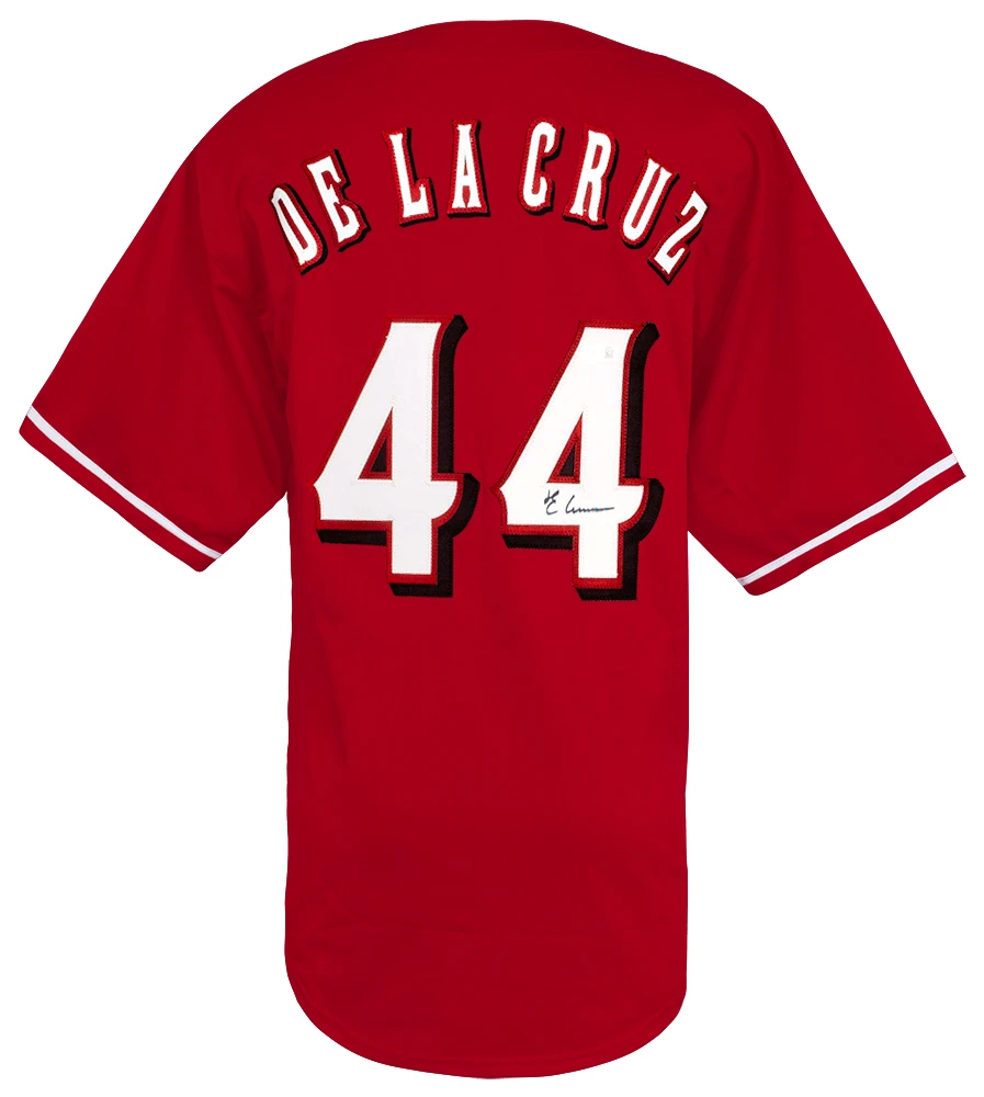 Elly De La Cruz signed red custom baseball jersey. Item comes with a Beckett Authentication tamper evident numbered sticker and Certificate of Authenticity which can be verified online. Jersey is size XL.