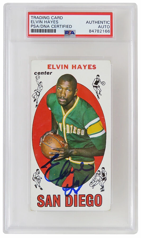 Elvin Hayes signed 1969-70 Topps Tall Boy rookie basketball trading card #75. The card has been authenticated and encapsulated by PSA and the authentication number can be verified online. The image of the item is a stock photo, as we may have multiples of the item in stock. The Slabbed Card you will receive will be of the card described. (Same grade, Same authentication) You may or may not receive the exact PSA serial number on the slab label shown in image.