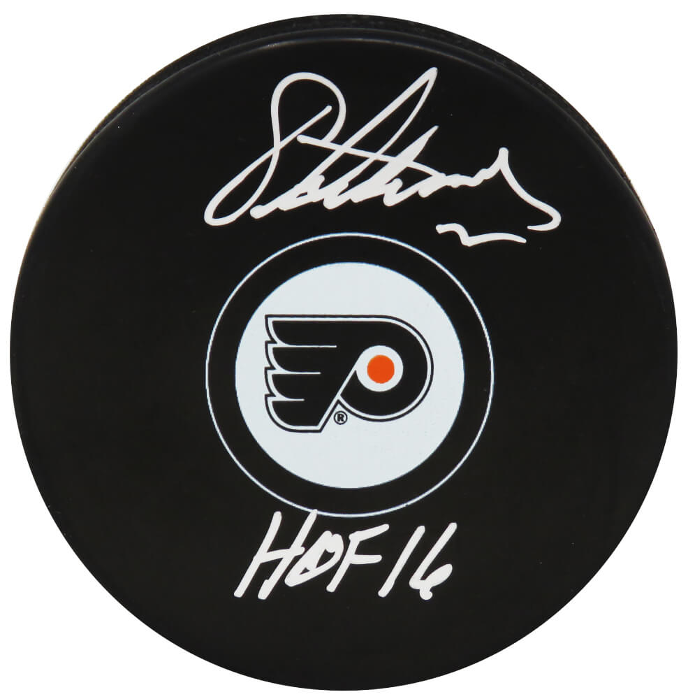 Eric Lindros signed Philadelphia Flyers logo hockey puck with ‘HOF 16’ inscription. Item comes with a Schwartz Sports Memorabilia tamper-proof numbered hologram and Certificate of Authenticity which can be verified online.