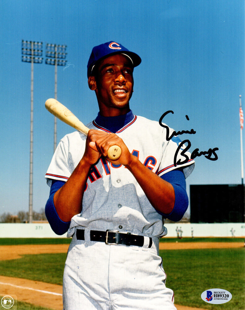 Ernie Banks signed Chicago Cubs holding bat pose 8×10 photo. Item comes with a Beckett Authentication tamper evident numbered sticker and matching Certificate of Authenticity which can be verified online.