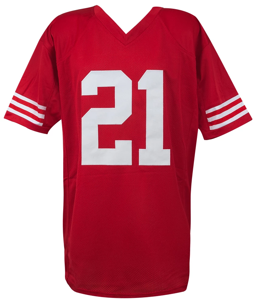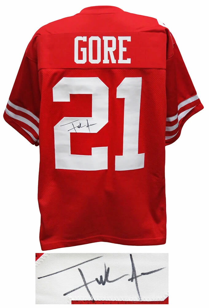 Frank Gore signed red custom football jersey. Item comes with a Schwartz Sports Memorabilia tamper-proof numbered hologram and Certificate of Authenticity which can be verified online. Jersey is size XL.