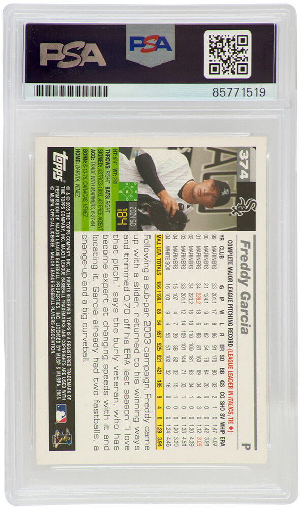 Freddy Garcia signed Chicago White Sox 2005 Topps baseball trading card #374. The card has been authenticated and encapsulated by PSA and the authentication number can be verified online.