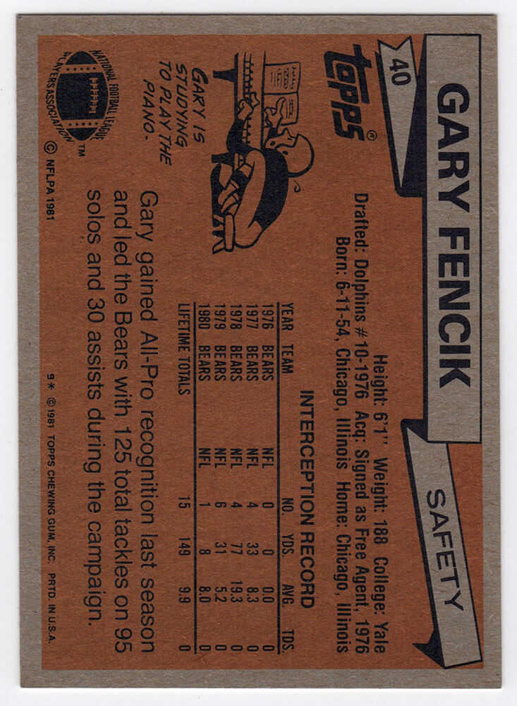 Gary Fencik signed Chicago Bears 1981 Topps football trading card #40. Item comes with a Schwartz Sports Memorabilia tamper-proof numbered hologram (on back of physical card) and Certificate of Authenticity which can be verified online.