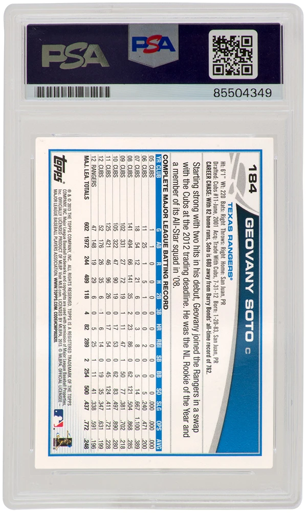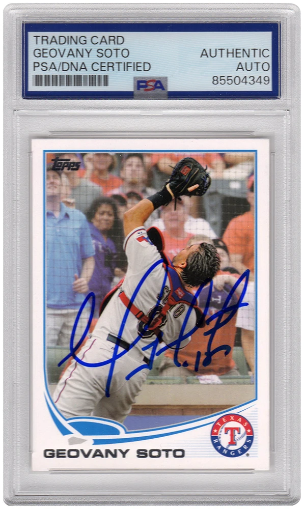 Geovany Soto signed Texas Rangers baseball trading card (various cards). The card has been authenticated and encapsulated by PSA and the authentication number can be verified online.