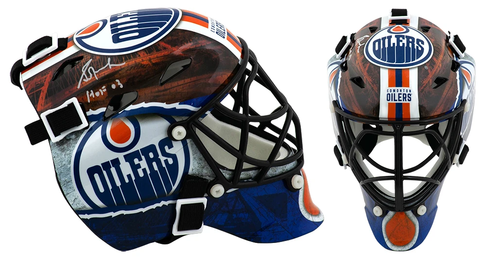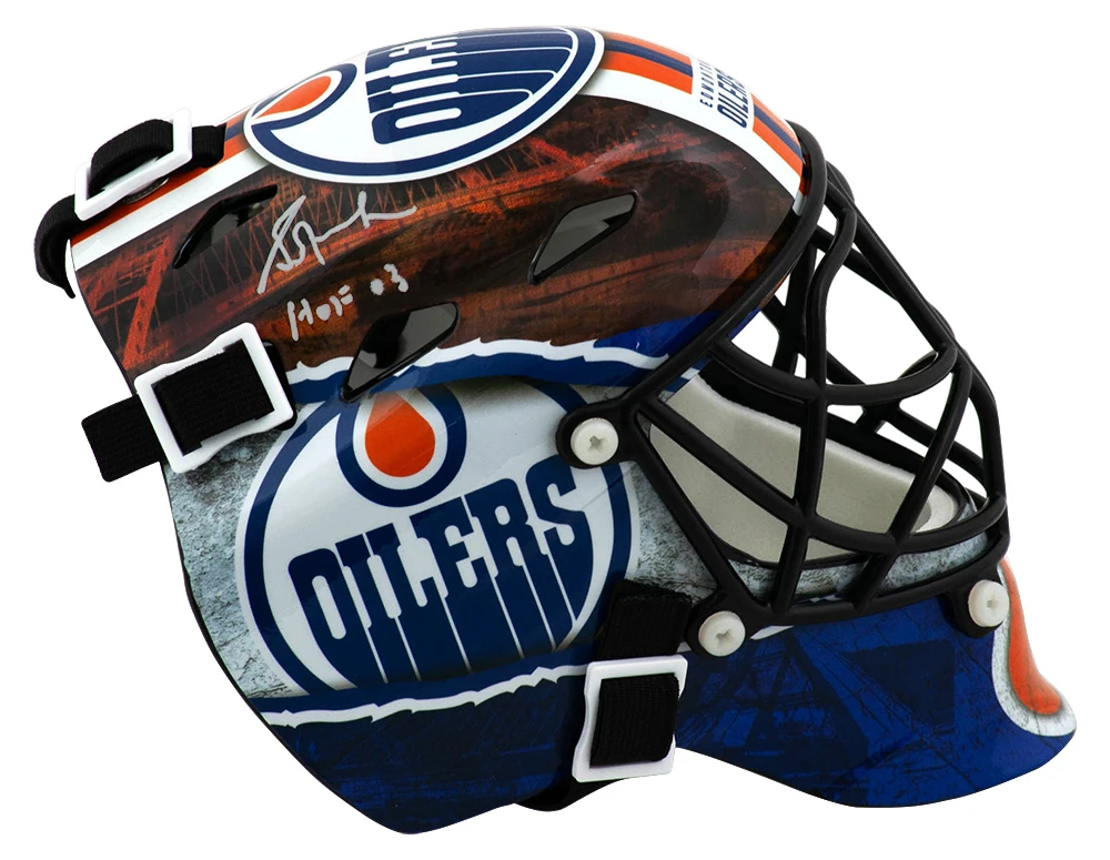 Grant Fuhr signed Edmonton Oilers mini hockey goalie mask with ‘HOF 03’ inscription. Item comes with a Schwartz Sports Memorabilia tamper-proof numbered hologram and Certificate of Authenticity which can be verified online.