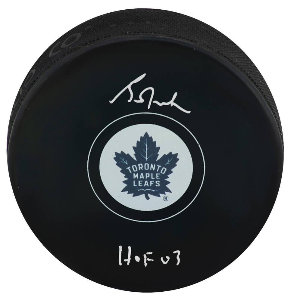 Grant Fuhr signed Toronto Maple Leafs logo hockey puck with ‘HOF 03’ inscription. Item comes with a Schwartz Sports Memorabilia tamper-proof numbered hologram and Certificate of Authenticity which can be verified online.