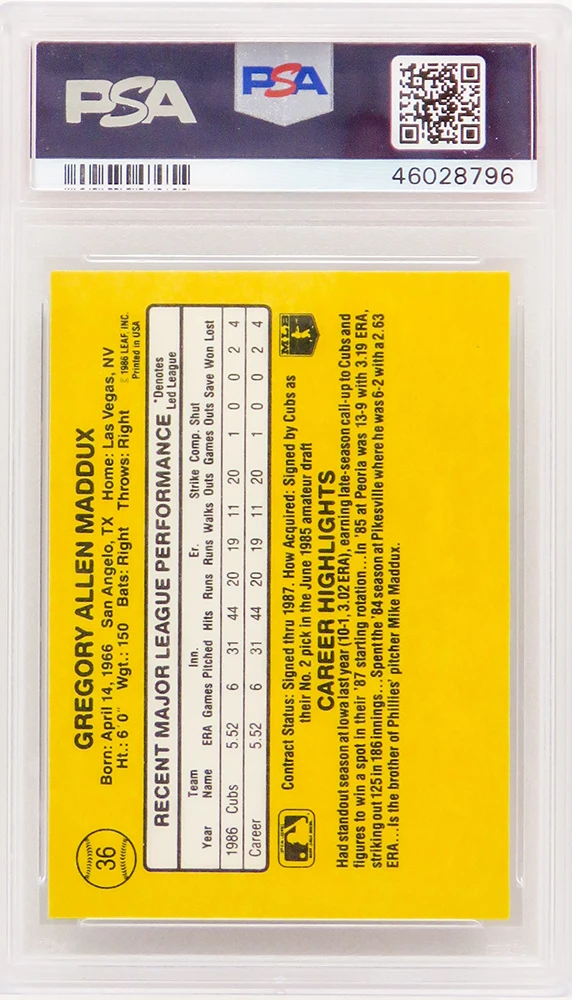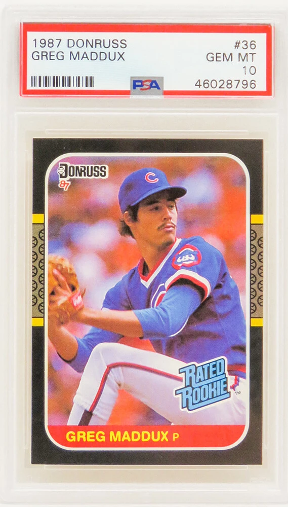 This is for one (1) Greg Maddux Chicago Cubs 1987 Donruss baseball #36 rated rookie card, which has been encapsulated and graded Gem Mint 10 by PSA, the highest grade available for this Mint condition card. We have more than one of this Graded Card in stock in the same PSA grade. We have included a stock photo for this item and the Graded Card you will receive will be of the card described, with the same grade as shown. You may or may not receive the exact PSA serial number on the slab label shown in image.