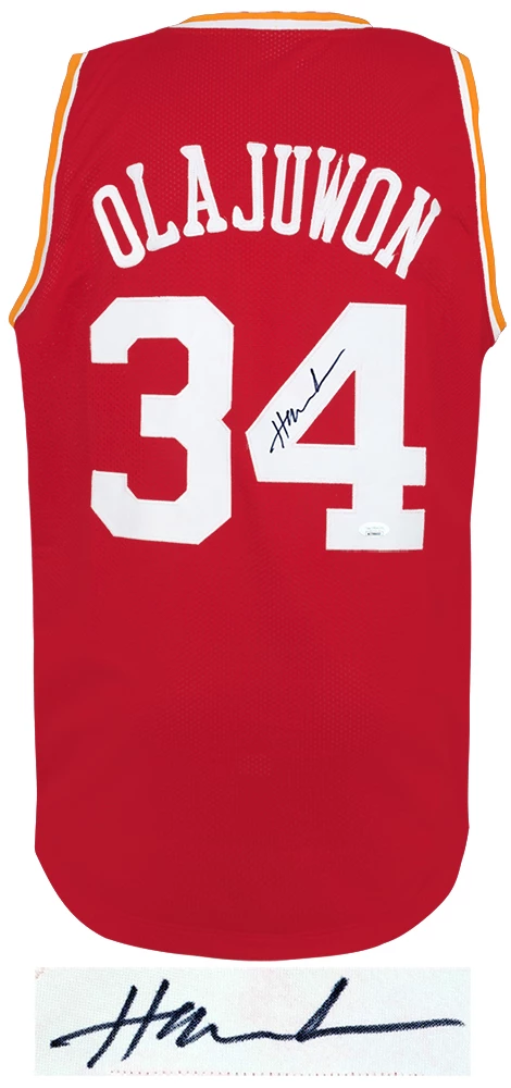 Hakeem Olajuwon signed red throwback custom basketball jersey. The front of the jersey has ‘The Dream’ and number 34 on it. Item comes with a JSA (James Spence Authentication) tamper evident numbered sticker and matching Certificate of Authenticity which can be verified online. Jersey is size XL.
