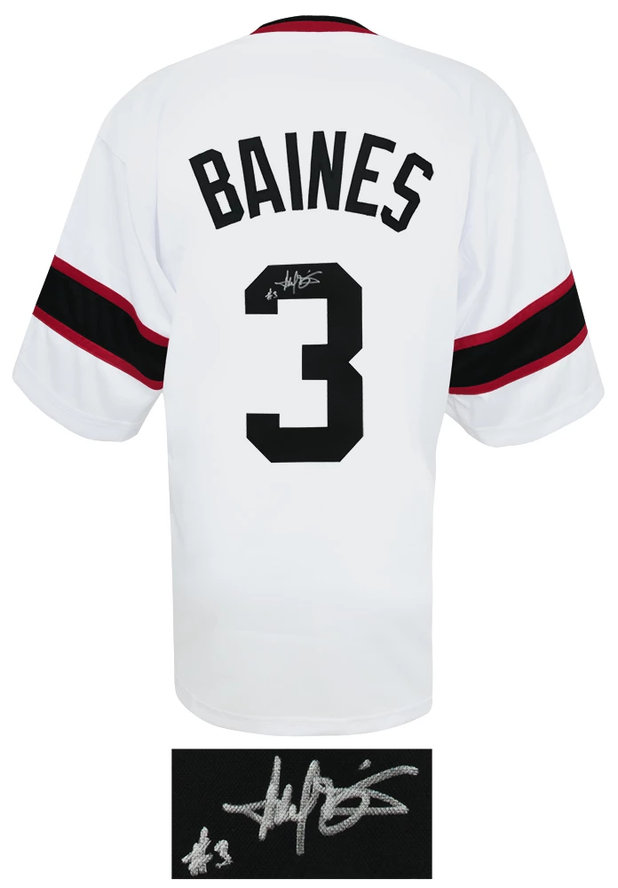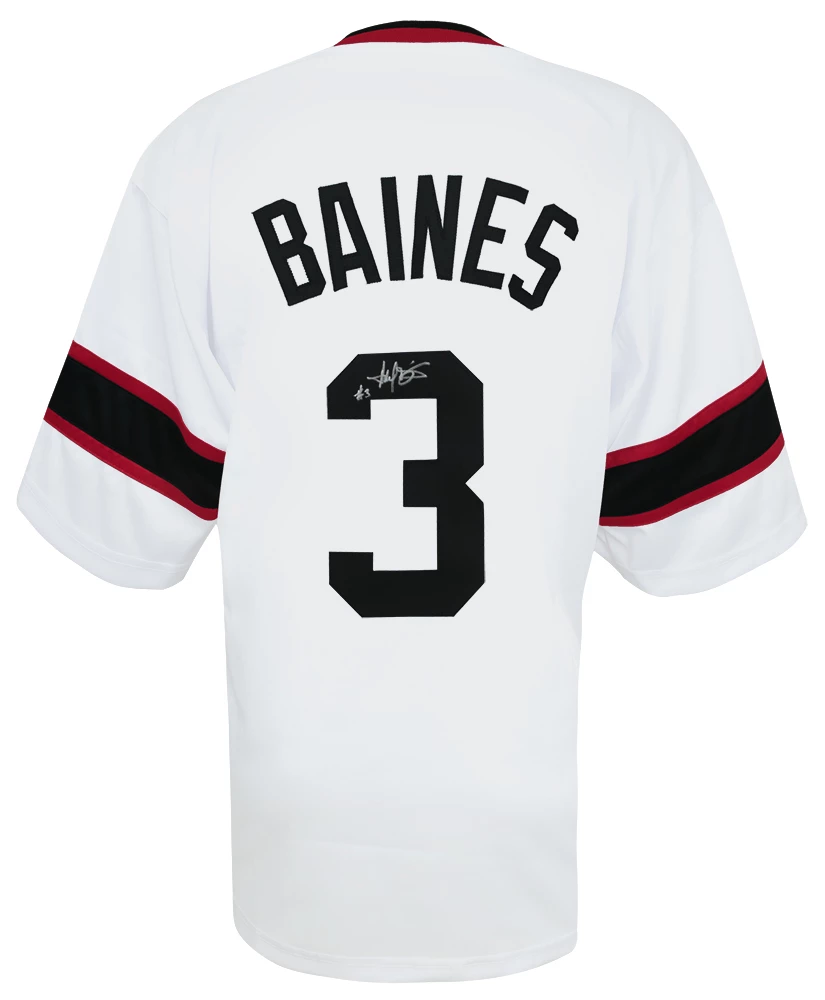 Harold Baines signed white throwback custom baseball jersey. Item comes with a Schwartz Sports Memorabilia tamper-proof numbered hologram and Certificate of Authenticity which can be verified online. Jersey is size XL.