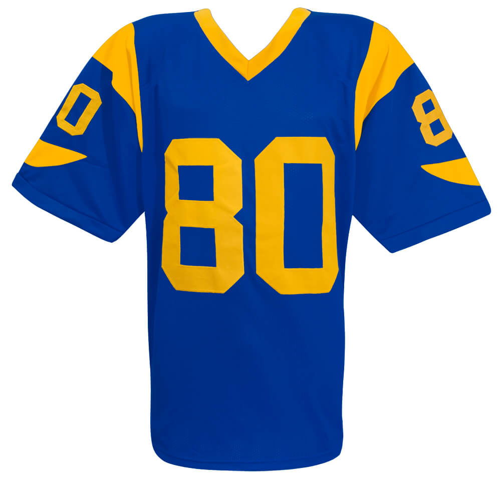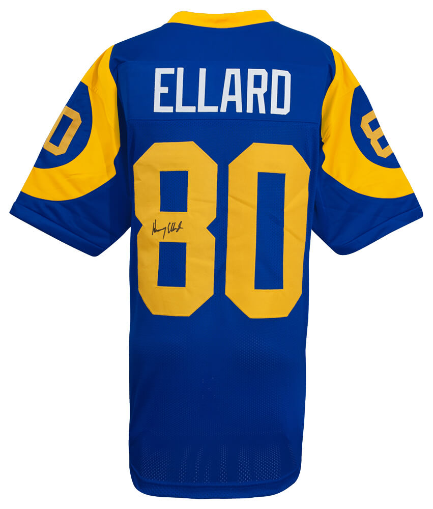 Henry Ellard signed blue custom football jersey. Item comes with a Schwartz Sports Memorabilia tamper-proof numbered hologram and Certificate of Authenticity which can be verified online.