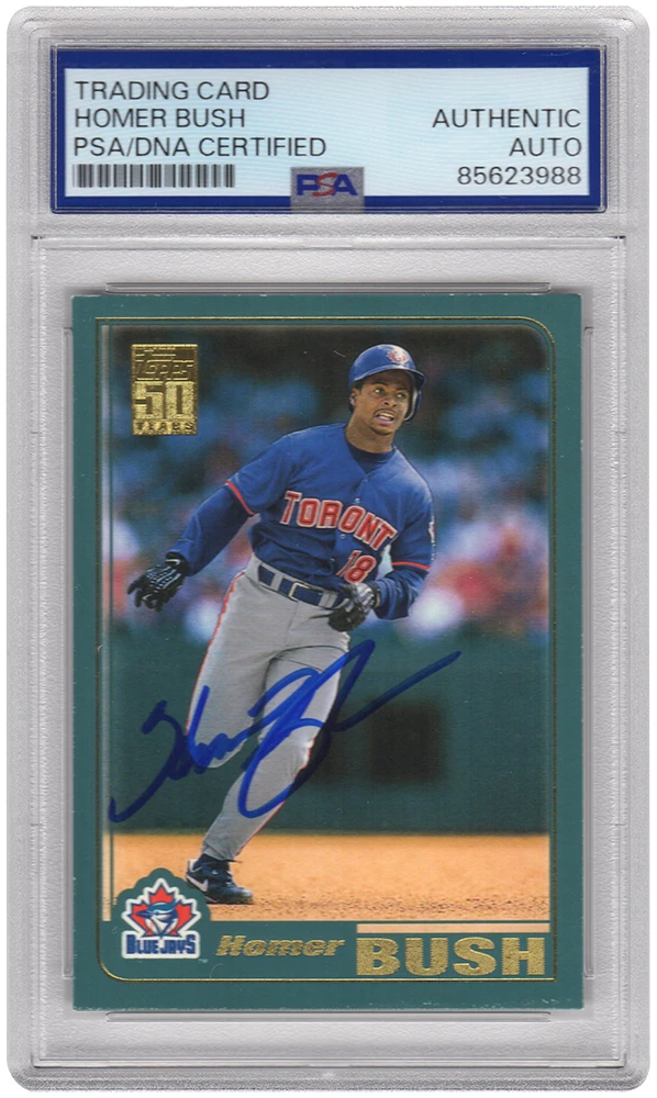 Homer Bush signed Blue Jays baseball trading card (various cards). The card has been authenticated and encapsulated by PSA and the authentication number can be verified online.